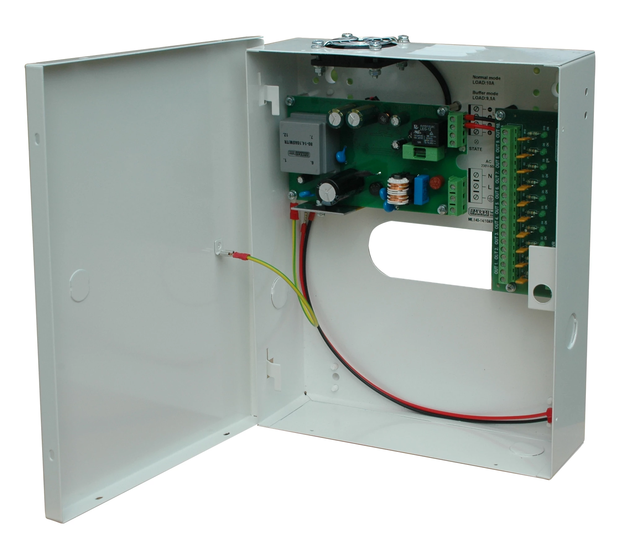 ICP-M121010U, szünetmentes tápegység, fémdobozban, 10.000mA, 10 csatornás tápfeszültség elosztóval. 10.000mA, 12V-13.8V szabályozható, ipari kivitelű fémdobozban (max. 12V/7Ah akkumulátornak hely), 10db 1A-es biztosítékkal védett kimenet (10 csatornás tápfeszültség elosztó), akkumulátor töltő, kapcsolóüzemű stabilizált tápegység. Terhelés nagyságának méretezésénél gondoljunk az akku töltő áram nagyságára is,melyet az akku kapacitása határoz meg. Védelmek: túlterhelés, rövidzár, túlmelegedés, túlfeszültség, mélykisülés, akku fordított polaritás (biztosíték). LED -es állapot visszajelzés.