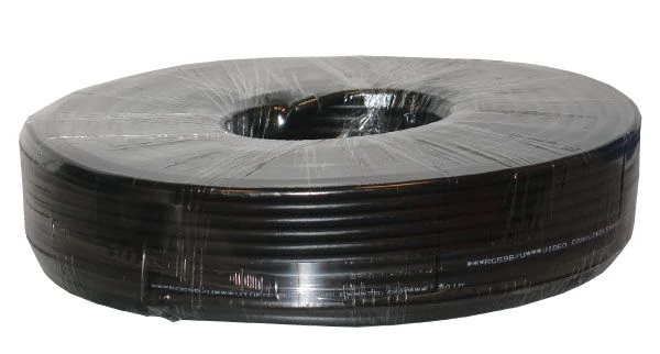 Kábel, RG59UMILC17, 75 OHM koax, fekete. Kültéri UV-álló, fekete színű. 75 ohmos koax videojelhez, rézzel futtatott acél vezető, sűrű rézharisnya árnyékolás.